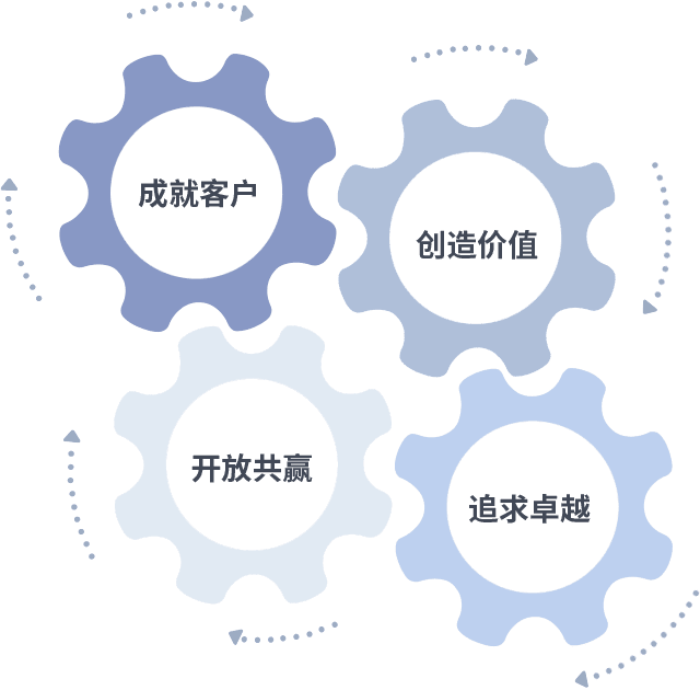 成就客户是一切决策的出发点,,,,创造价值是衡量所有工作的标准,,,追求卓越是我们做事做人的态度,,开放共赢是我们的格局也是最终的结果。。价值观的齿轮环环相扣,,,推动着组织里的每个人不断向前。。